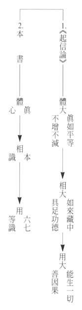 《起信論》云:「一者體大,謂一切法真如平等不增減故;二者相大,謂如來藏具足無量性功德故;三者用大,能生一切世間出世間善因果故。」(註一七)