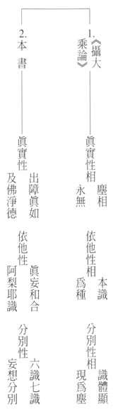 我們由這兩對四例看來,對於作為體大的真實性的真如心,三書所說是一致的。到了依他性的本識上面,本書便脫離了《起信論》之相大所持的觀點,而採用了《攝大乘論》所持本識的思想,說為真妄和合的阿梨耶識,而不是《起信論》所說的如來藏具足的無量性功德了。再說《起信論》的用大,是指清淨功德所權現的世出世間的善因果法,與《攝大乘論》所說由識體顯現的塵相之分別性相,並不相同,本書接受了《攝大乘論》所持的識體顯現,而說的分別性,便是六識七識的妄想分別,此妄想分別,當然也與《起信論》所持用大的內容不同,善因果法集亦是妄想分別,但其並非出之於妄想分別。