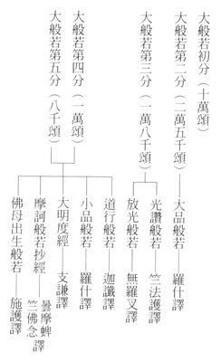 的初譯是西晉竺法護的《光讚般若》;此兩種《般若》的漢譯,各有數種。現在根據龍山章真的《印度佛教史》第三篇第二章,將《小品般若》及《大品般若》在《大般若經》中的地位及其異譯,列表如下: