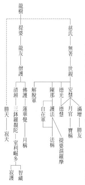 到此,我們可將西藏佛教源頭的印度三系人物之傳承關係,列表如下: