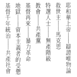 事實上,基督教的理想社會,只是向牛角尖裡找出路罷了。這是猶太民族的思想路線,同時也是徹底錯誤的思想路線,基督教吸收以後,作為教理的經緯,共產主義的馬克思吸收以後,則成為其社會主義的原則。其兩者對照,英人羅素為之列表如下︰