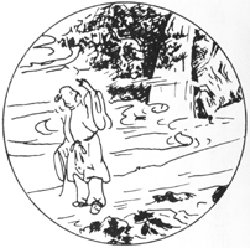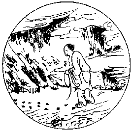 尋牛──圖中畫著一個人,手裡拿著牛繩,奔向郊外,尋找他的牛,但他尚不知牛在何處。此是吾人發覺了自己被困於煩惱虛妄之中,迷失了自己的本來面目的自性之牛,也就是對於見性開悟的事,已經有了追求嚮往之心,開始用功修行的階段。其頌文,即是用心修行的情況,是這樣的: