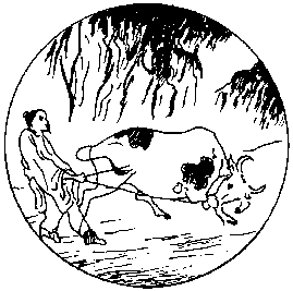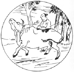 牧牛──圖中的人,小心翼翼地拿著牛鞭,握著牛索,控制著一條野性未服的牛,如有一個疏忽,這條牛仍有走向路邊的田裡偷吃幾口莊稼五榖的可能。此是說明吾人在開悟之後,不可掉以輕心,不要太高興,必須小心謹慎地繼續不斷地,去做調伏煩惱、收攝妄心的工夫,否則,煩惱未除,隨時仍會有貪、瞋、癡等的事情發生。頌文是: