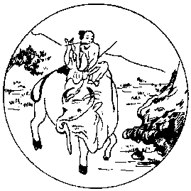騎牛歸家──圖中的人,騎在一條已經馴服的牛背上,將牛索輕鬆地繫在腰間,雙手拿著橫笛,吹奏著悠閒的牧曲。這是說明經過一段時日,做完調心的工夫之後,煩惱妄想,已經完全被修行者調伏,心頭不再有染污的妄念蠢動,乃是一片純和明朗的景象,漸漸地要回到純淨無染的心境中去了。頌文是: