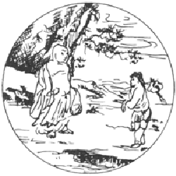 入鄽垂手──圖中畫一個灑脫自在而提著一隻布袋的和尚,面對著一個瘦弱貧苦的乞丐,和尚做布施,乞丐求布施。這是說明修行者於成就了道業並且得到解脫自在之後,便會自然生起廣度眾生的大慈悲心,這是向上自求解脫之後的必然結果,不假意志,不循理想,不是為了什麼使命,只是自然而然地從個人的修行生活之中,走向協助他人的行動中去而已,所以在其本身不名為救世化眾,只是一種出自天真的遊戲三昧。頌文是: