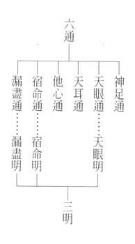 六通與三明,關係殊為密切,六通是三明的根本,三明是六通的昇華,有了三明的,無不具足六通,具足六通的,亦將得到三明。六通與三明,可以下表說明之: