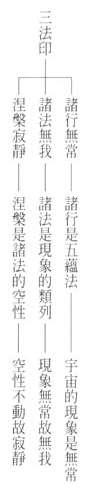 這是一切法的準則或原理。所謂佛法,無非是從這準則的基礎上開發出來,所以,凡是合乎這個準則的思想,不論出於何人的發明,均可稱為佛法。以這三句話來印證一切的思想,只要不違背這三句話的準則,即是佛法。這是佛法與非佛法的度量衡,所以稱為三個佛法的印鑑。