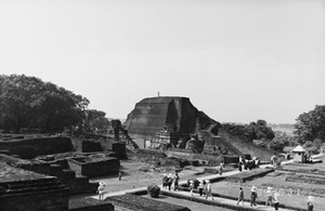 那爛陀寺,當地稱為那爛陀大學,我們到達之後,有幾位服務人員帶領我們進入大門,再登上主要建築物的基臺中心,可以看到右後角的舍利弗紀念塔的遺跡,也可以看到四周大小僧房和講堂的基腳,都是由大塊的紅磚砌成,顏色非常古樸,排列極其整齊,配置也很緊密,東西南北雖然設有許多高低大小不同的建築物基礎,但是彼此連接,頗有一氣呵成之勢。由此不難想像,當年曾有上千的教授和上萬的學生在此分作瑜伽、中觀、真言密教等各派的研究學習,弘揚大乘佛法,它應該是佛教史上最早的綜合性的大學。到目前為止,還沒有一個佛教的學府能超過這樣的規模,可惜印度當代的那爛陀大學,設立在另一個地方,此地的舊址僅供朝聖者憑弔。