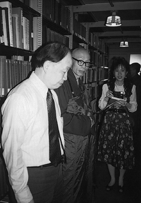 ▲耶魯圖書館長龔文凱先生陪同參觀,東亞收藏部劉裘蒂小姐在書庫內找來作者的《明末佛教研究》表示歡迎。