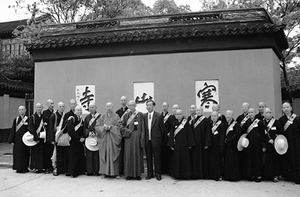 ▲作者率農禪寺常住法師和寒山寺住持性空法師(左八)合影。