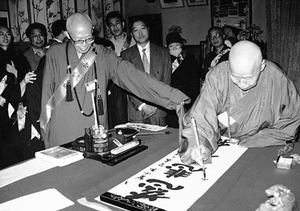 ▲性空法師當場揮毫。作者聖嚴法師在旁為他提起袖襬,以免沾濡到墨漬。師兄弟的情誼溢於言表。