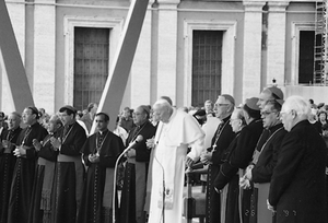 已經相當衰老。這一天他出現在廣場之時,站在一輛敞蓬的吉普車上,由大教堂背後的左側繞道進入廣場下層,然後繞著廣場,內內外外轉了兩圈,才到了上層的廣場。