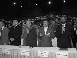 - 一、如何化解衝突?不論是宗教、政治、文化等各種族群之間,均應有「求同存異」的共識,也就是在追求共同的利益和目標之時,不妨允許有歧異的想法和做法,這就好比共同生活在一個家庭之中的成員,也允許有不同的想法和做法一樣。中國儒家主張「和而不同」,佛說「眾生有種種根性,都有成道的機會」;又說「叢林之中,能容千萬種眾生」。其實,宗教不會有衝突,被信的神也不會有問題,唯有人類愚昧的詮釋,才會造成對立與衝突。所以我們必須呼籲:凡在聖典中見到有與人類和平抵觸的文字,均應給予新的詮釋。
