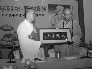 的。想不到這位年輕的法師,已經相當現代化了,不過這也是此行中唯一的例子。同時我也發現就在這座講堂裡,我和他兩人座位背後的上方,掛著一幅背景圖,用漢文及韓文寫著「馬祖及其洪州宗國際學術研討會」。那表示最近佑民寺曾經和韓國的佛教團體,舉辦過一次與馬祖相關的學術討論會,怪不得這位方丈有國際的視野和氣度了。