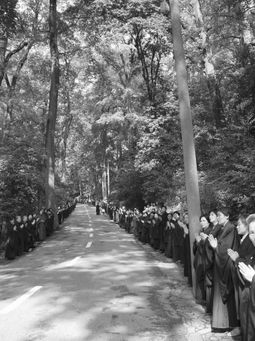 我們乘坐中型巴士,抵達麓山寺的坡道入口處,就已看到聖輝法師率領全寺的僧眾和尼眾學僧一百多人,以及信眾上千人,列隊於坡道的兩側,