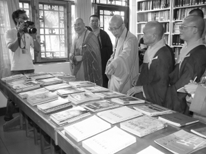 ▲麓山寺方丈聖輝法師帶領參觀湖南佛學院圖書館。
