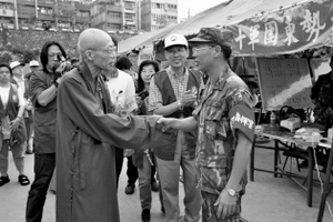 ▲在災區,除了為罹難者祝禱,關懷受災者以外,聖嚴法師也特別向全力救災的國軍官兵感謝致意。