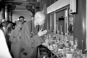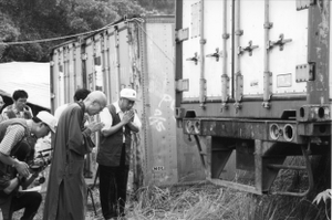 ▲簡單的停靈帳旁,一櫃櫃臨時冷凍冰櫃中,裝滿了震災中的罹難者,心痛的聖嚴法師,也沉重地向冰櫃中的亡者祝禱,祈願他們不再受苦。