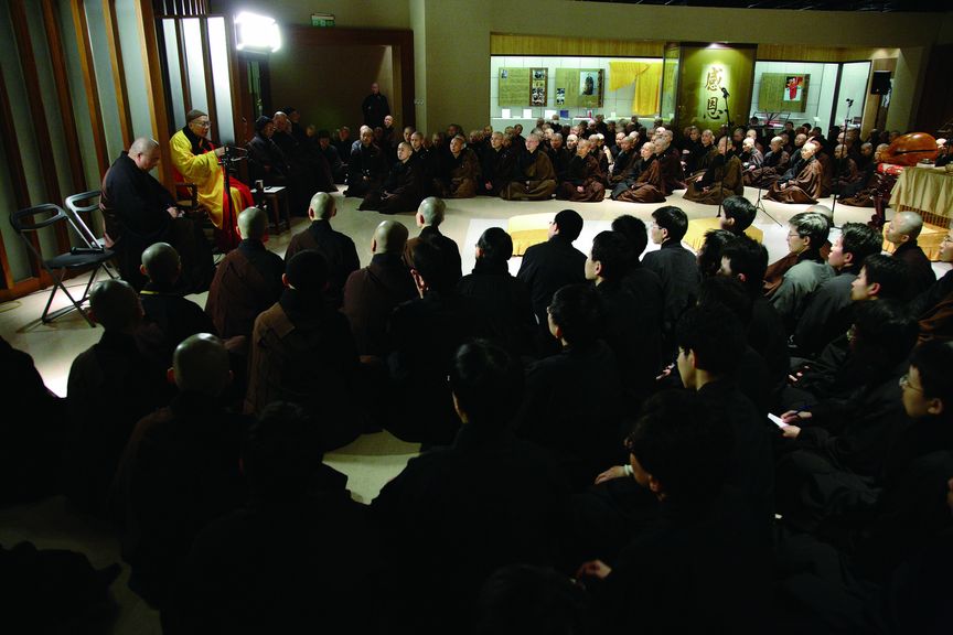 聖嚴法師在開山紀念館,為辭歲禮祖的僧眾開示,提醒眾人莫忘自己「上求佛道,下化眾生」的使命。